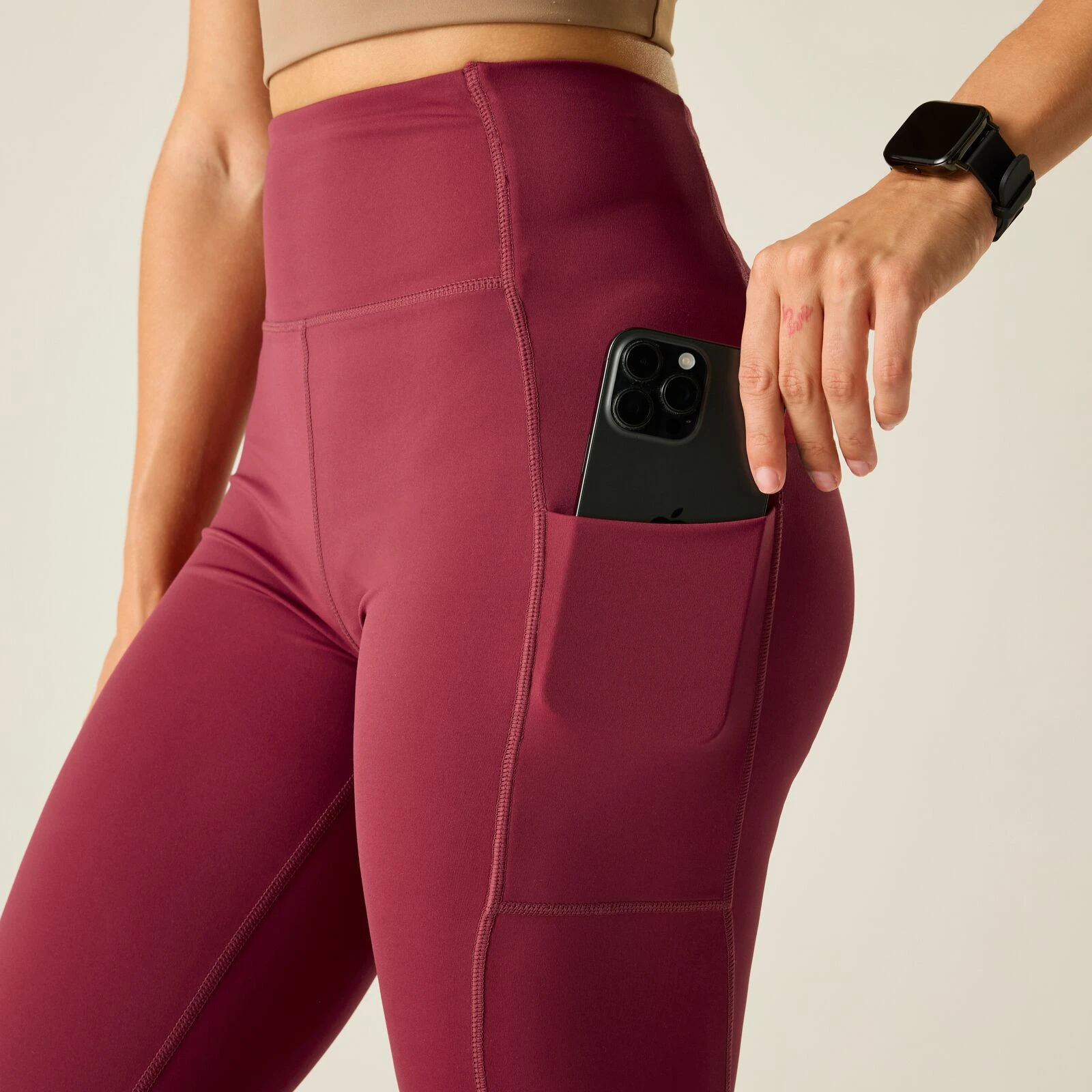 Mit flachen Nähten und einer antibakteriellen Behandlung gegen Geruchsbildung ohne synthetische Chemikalien sind die Leggings auf dauerhaften Komfort ausgelegt. Vorne befindet sich eine praktische obere Handytasche und eine offene Innentasche für Kleinigkeiten. Auf Squat-Beständigkeit getestet, was für mehr Sicherheit beim Training sorgt.