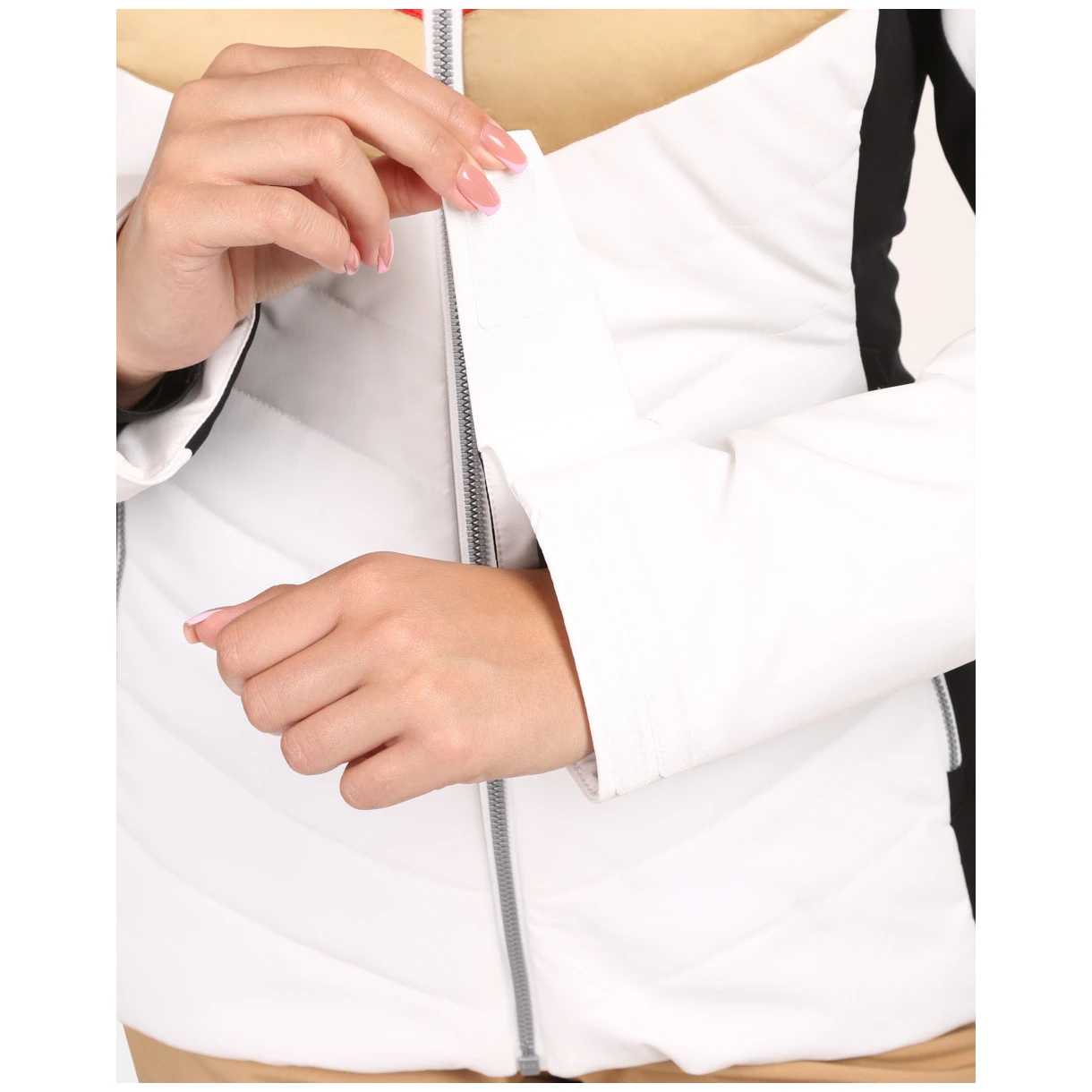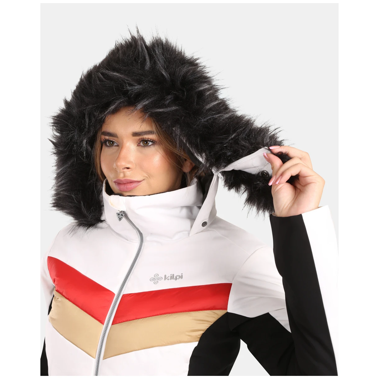 Die Jacke hat durchdachte Details wie eine geräumige, feste Kapuze mit abnehmbarem Kunstfell, eine Skipasstasche und eine Innentasche mit Brillenputztuch. Außerdem ist sie mit einem inneren Schneefang und verklebten kritischen Nähten ausgestattet, die das Eindringen von Feuchtigkeit verhindern. Dank des eleganten Designs und des Schnitts, der der weiblichen Figur schmeichelt, ist sie ideal für den Alltag und den Wintersport.