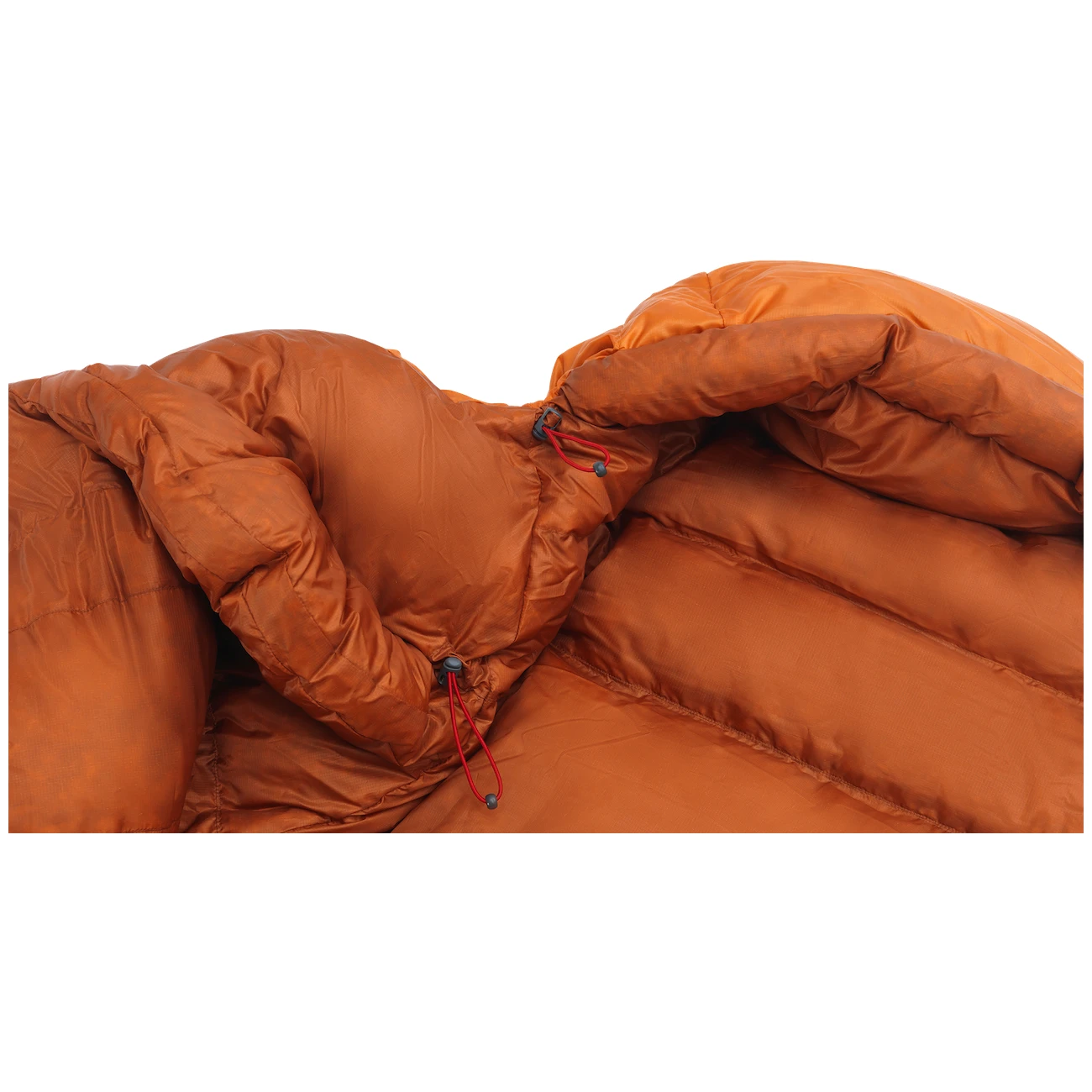Die Konstruktion optimiert die Füllkraft und die Wärmeleistung ohne unnötiges Volumen. Er hat eine Füllung aus Entendaunen mit einer Füllkraft von 850 cuin und einem Verhältnis von 90/10 Daunen, die perfekt isolieren. Unterstützt wird dies durch den Mumien-Schnitt mit einem schützenden Kragen für Gesicht und Nacken, einem Kragen im Schulterbereich, der das Eindringen von Kälte verhindert, und einer Abdeckleiste über die gesamte Länge des Reißverschlusses. Der Bereich um die Füße ist speziell in Form einer Haifischflosse angepasst, sodass die Füße in einer natürlichen Position bleiben können und zusätzliche Isolierung erhalten. Die Kapuze ist an beiden Seiten mit Kordelzügen ausgestattet.