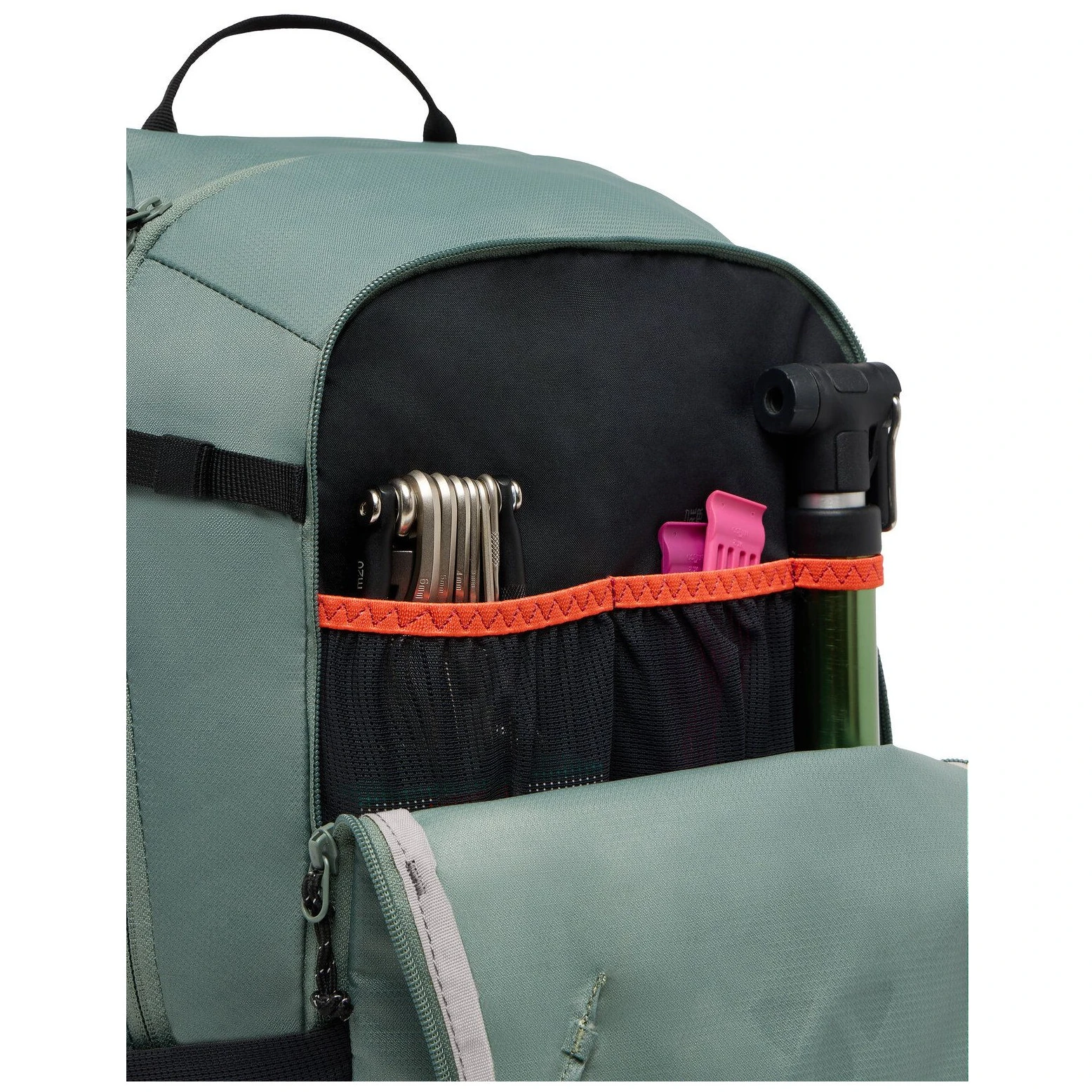 Werkzeugtasche vorne, ideal zur Aufbewahrung einer Pumpe, von Werkzeugen und einem Ersatzschlauch