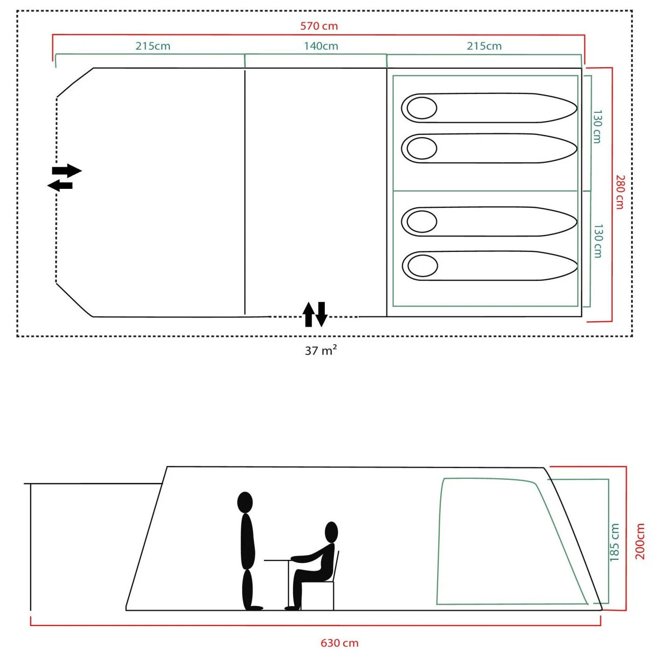 Es wird vor allem bei Familienzelten verwendet, bei denen der Schwerpunkt auf nutzbarem Raum und Komfort liegt. Mehr Schlafzimmer bedeuten mehr Privatsphäre und mehr Vielfalt im Innenraum.
