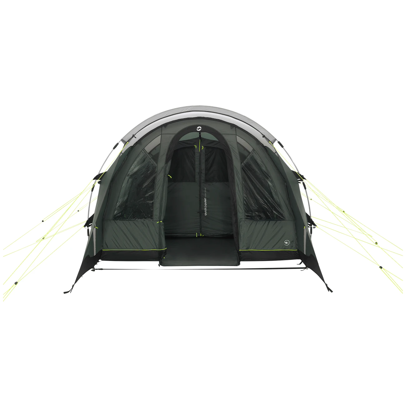 Das Zelt hat einen barrierefreien Eingang mit Moskitonetz, der komplett auf eine Seite gerollt werden kann. Der geräumige Vorraum hat ein großes Vordach vor dem Eingang, eine Bodenplane, ein helles Dach und getönte Fenster, die den Raum ausreichend beleuchten, aber gleichzeitig vor Sonne und UV-Strahlung schützen. Wenn Sie mehr Privatsphäre wünschen, schließen Sie die Vorhänge einfach auf die gewünschte Fensterhöhe. Im Anschluss an den Flur befinden sich zwei verdunkelbare Schlafzimmer mit Moskitonetzen, die Raum für ungestörten Schlaf bieten. In die Türen sind eingenähte Magnetstreifeneingearbeitet, die einen schnellen und geräuschlosen Einstieg ins Zelt ermöglichen. Für einen sichereren Verschluss stehen selbstverständlich auch Reißverschlüsse zur Verfügung.