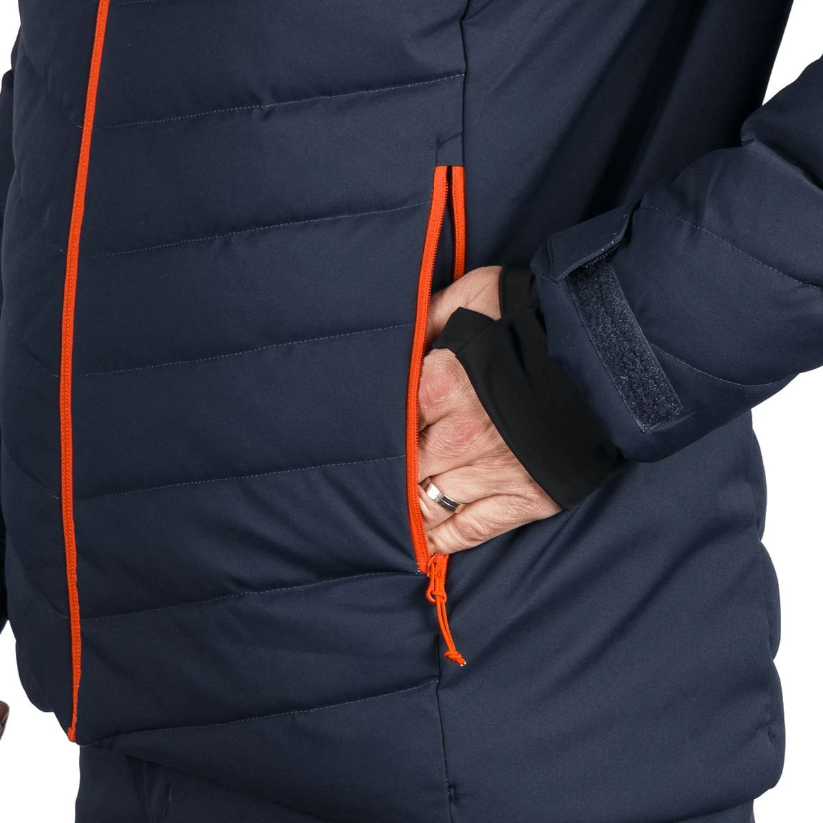 Die Jacke enthält alles, was Sie zum Skifahren benötigen: einen Schneefang, zwei Seitentaschen mit Reißverschluss, eine Innentasche für Brillen, eine innere Brusttasche, äußere Brusttaschen und eine Skipasstasche am Ärmel. Der Schneefang und der mit einer Leiste unterlegte Reißverschluss schützen vor Zugluft und erhöhen den Wärmekomfort.