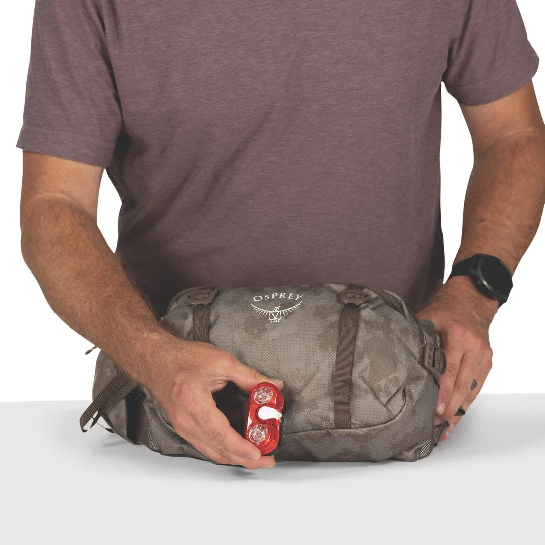 Seitliche Kompressionsriemen sichern den Inhalt, verkleinern die Hüfttasche und ermöglichen die Befestigung einer leichten Jacke oder eines Pullovers. Reflektierende Elemente und eine Schlaufe zur Befestigung eines Blinklichts (nicht im Lieferumfang enthalten) sind selbstverständlich.
