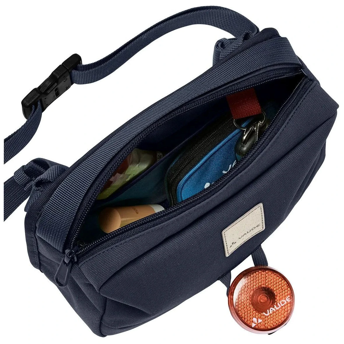 Das Hauptfach bietet ausreichend Platz für alle wichtigen Kleinigkeiten wie Telefon, Geldbörse oder Brille. Die rückseitige Reißverschlusstasche schützt Wertsachen und der integrierte Schlüsselhalter sorgt für Ordnung. Dank des Griffs und der Halterung für ein Sicherheitslicht ist die Minibag der ideale Begleiter für Stadt und Reise.
