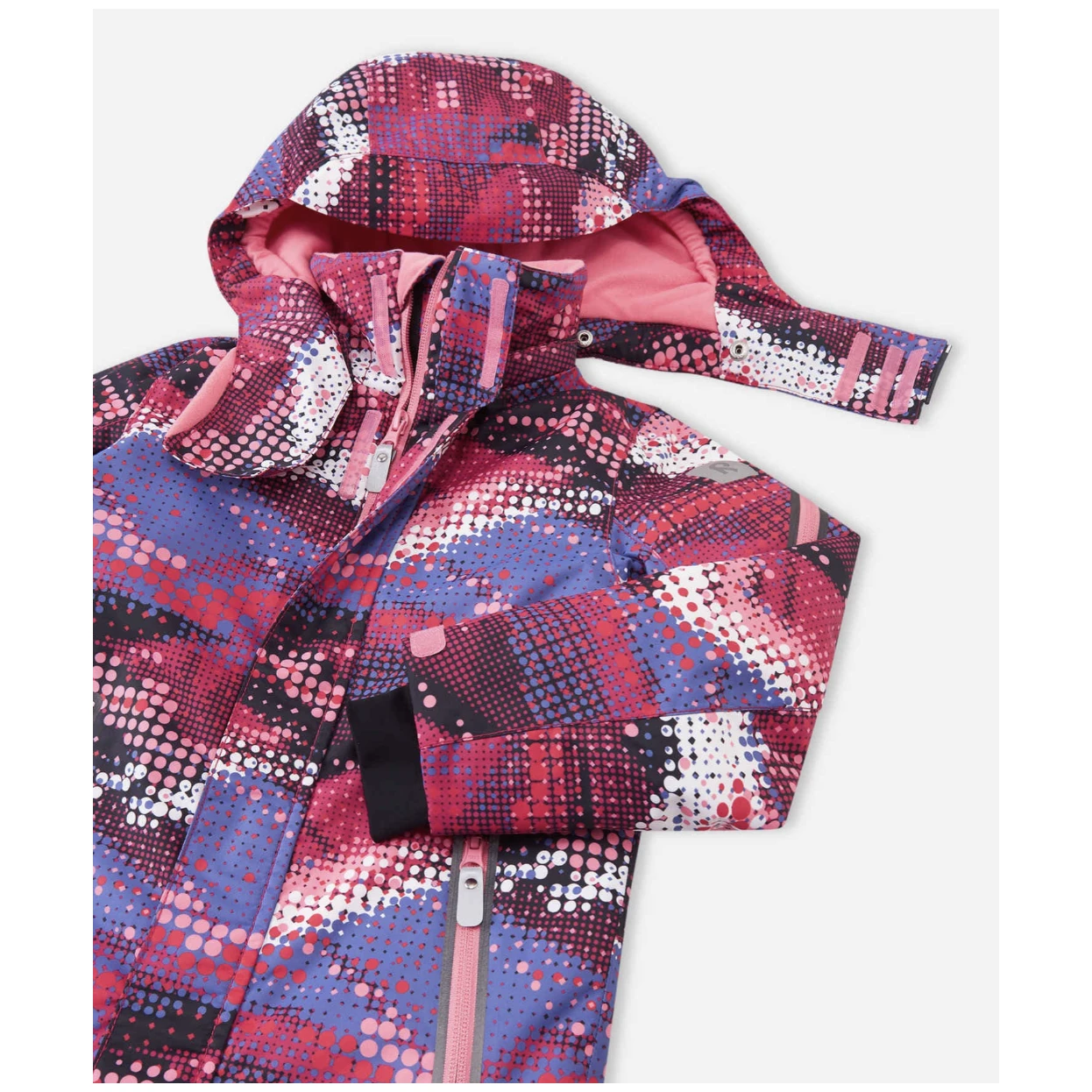 Der Overall hat eine abnehmbare und anpassbare Kapuze, die vor Wind schützt und sicher für Outdoor-Aktivitäten ist, da die mit Druckknöpfen befestigte Kapuze leicht abgenommen werden kann, wenn sie sich irgendwo verfängt. Reißverschlusstaschen, Skipass-Tasche am Ärmel. Das Material des Overalls ist schmutzabweisend und kann bei Bedarf gewaschen werden. Ergänzt wird dieser funktionelle, hochwertige Winteroverall durch reflektierende Details.