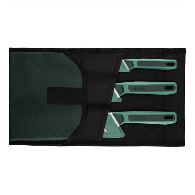 Das Set enthält ein großes Küchenmesser mit glatter Klinge und 8"-Klinge (203 mm), ein mittleres Messer mit Wellenschliff und 6"-Klinge (152 mm) und ein kleines Messer mit glatter Klinge und 3,25"-Klinge (83 mm). Jedes Messer ist mit einer Schutzkappe für die Klinge ausgestattet und alle drei passen in eine robuste Polyesterhülle, die im Lieferumfang enthalten ist.