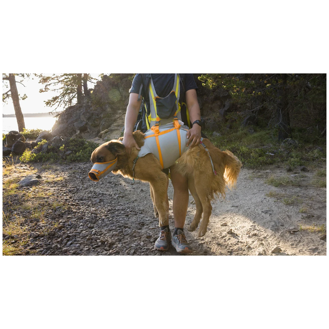 Notfallset Ruffwear BackTrak™ Dog Evacuation Kit ist für den Fall einer Verletzung des Hundes fernab der Zivilisation gedacht, damit Sie ihn aus eigener Kraft zurücktransportieren können. Das Set besteht aus zwei Teilen: einem leichten Maulkorb für Hunde und einer Weste mit Gurten zum Tragen des Hundes.