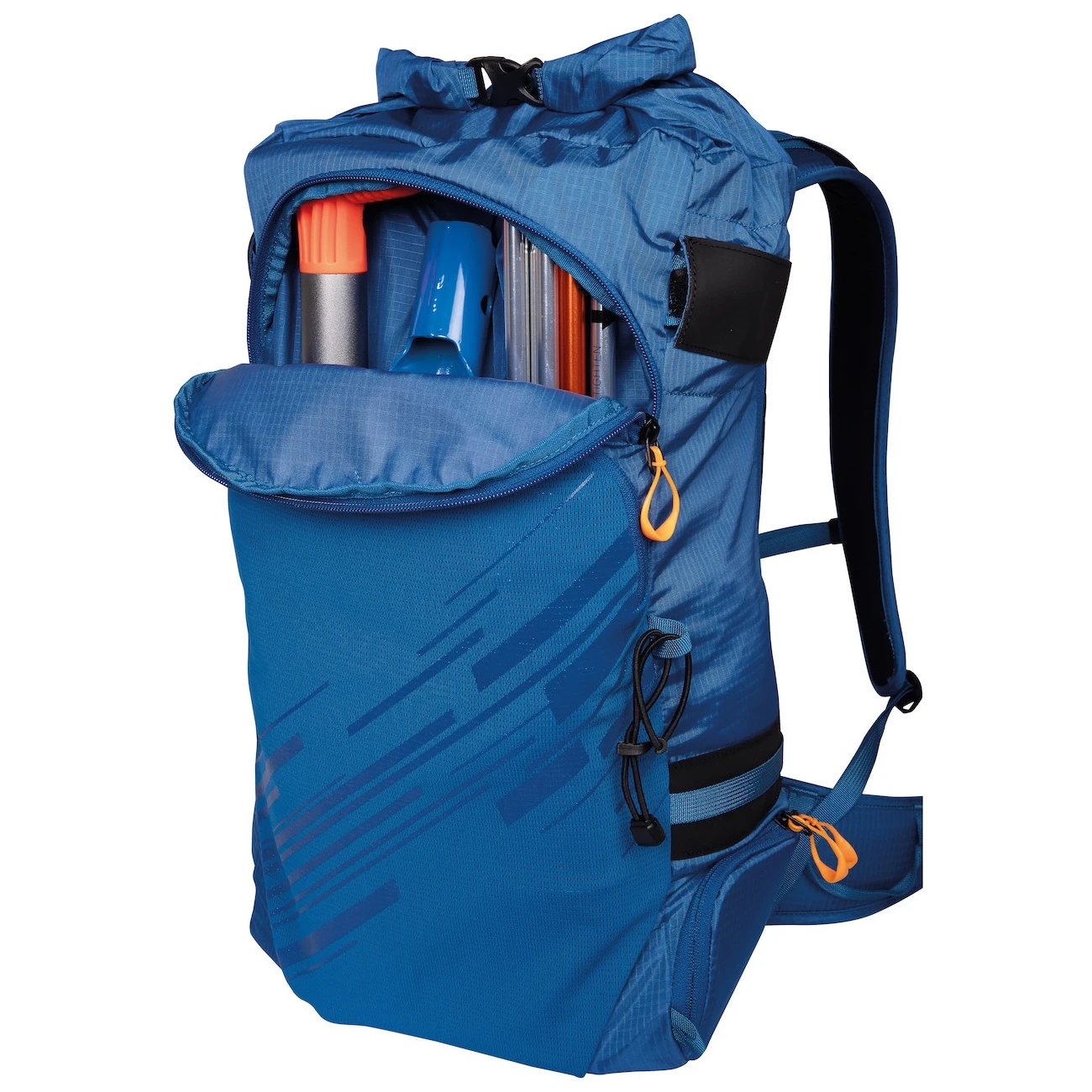 Sie erreichen das Innere des Rucksacks über eine Rolldeckelöffnung mit internem Kordelzug und eine breite Öffnung Full BackDoor. Innen befindet sich eine Tasche für eine Trinkblase und eine Innentasche mit Karabiner für Schlüssel. Eine elastische Fronttasche ermöglicht die Aufbewahrung von nassen Gegenständen.