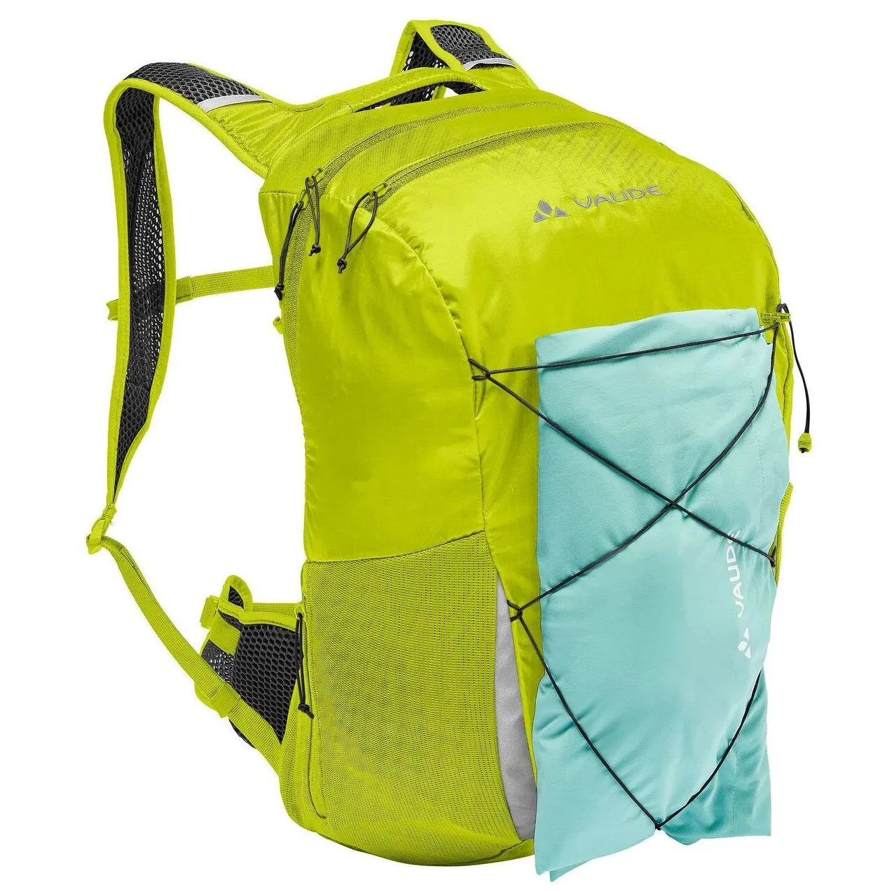 Der Rucksack wird aus ökologischen Materialien hergestellt: Das silikonisierte Hauptgewebe entsteht durch ein Massenbilanzverfahren aus recycelten Reifen, ergänzt durch recyceltes PET-Polyester. Die Eco Finish Oberflächenbehandlung ohne PFC weist Wasser und Schmutz ab. Die Zertifizierungen VAUDE Green Shape und bluesign® garantieren Nachhaltigkeit und faire Produktion.