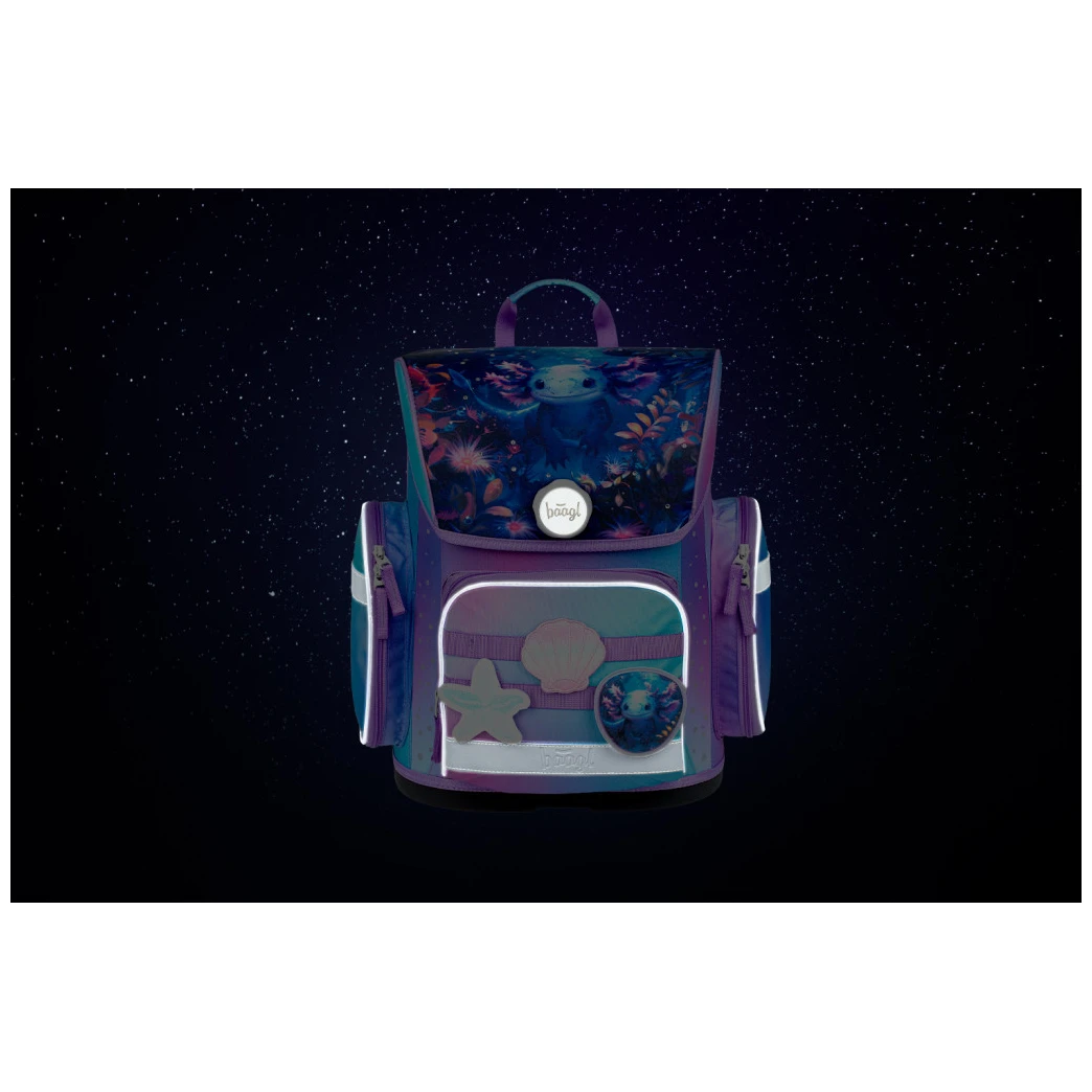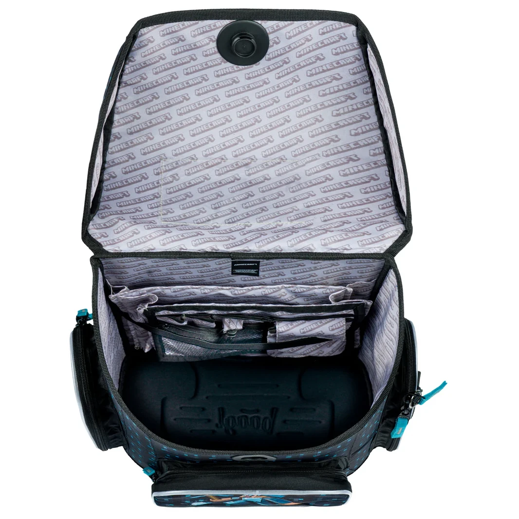Der Rucksack ist aus einem robusten und wasserabweisenden Material gefertigt. Die verstärkte Konstruktion und der feste Boden sorgen in jeder Situation für eine stabile Form. Außen befindet sich eine isolierte Vordertasche mit Reißverschluss und zwei Seitentaschen mit Reißverschluss, die sich ideal für eine Trinkflasche eignen. Das Hauptfach ist über einen Deckel mit magnetischem Fidlock-Verschluss zugänglich, der einfach zu bedienen ist. Er öffnet sich durch Drehen des Rädchens und schließt automatisch. Im Inneren des Fachs befindet sich ein Organizer, der hilft, das Gewicht der Schulbücher besser zu verteilen, sowie eine durchsichtige Tasche für den Stundenplan. Reflektierende Elemente, die auf allen Seiten angebracht sind, erhöhen die Sichtbarkeit des Kindes bei schlechten Lichtverhältnissen.