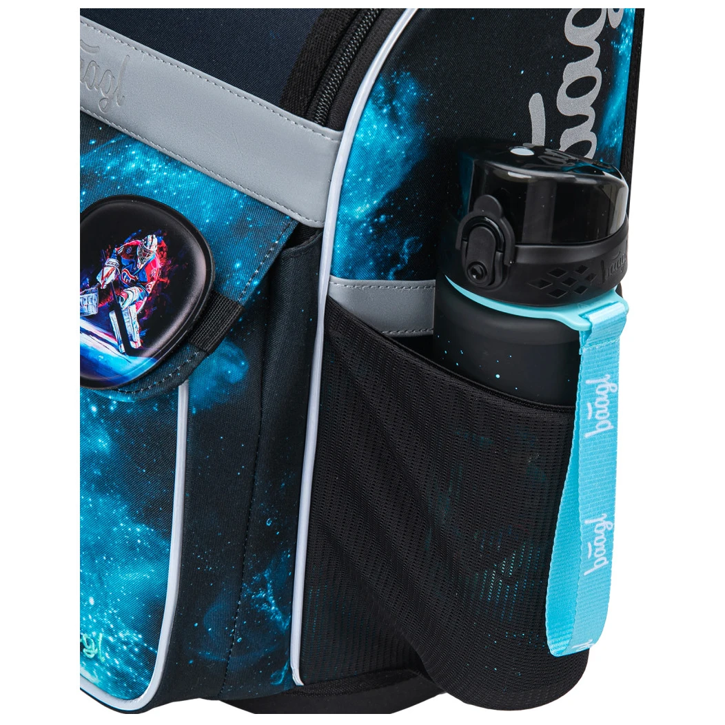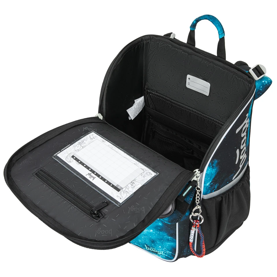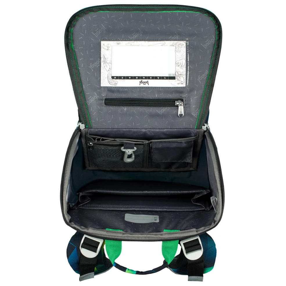 Der Rucksack ist aus einem robusten und wasserabweisenden Material gefertigt. Die verstärkte Konstruktion und der feste Boden sorgen in jeder Situation für eine stabile Form. An der Außenseite befindet sich eine isolierte Vordertasche mit Schnallenverschluss und zwei Seitentaschen mit Reißverschluss, die ideal für eine Trinkflasche sind. Das Hauptfach ist mit einem aufklappbaren Öffnungssystem zugänglich, das den Zugriff auf die Utensilien direkt aus der Schulbank erleichtert. Es wird mit einem Reißverschluss geöffnet. Im Inneren des Fachs befindet sich ein Organizer, der hilft, das Gewicht der Schulbücher besser zu verteilen, sowie eine durchsichtige Tasche für den Stundenplan. Reflektierende Elemente, die auf allen Seiten angebracht sind, erhöhen die Sichtbarkeit des Kindes bei schlechten Lichtverhältnissen.