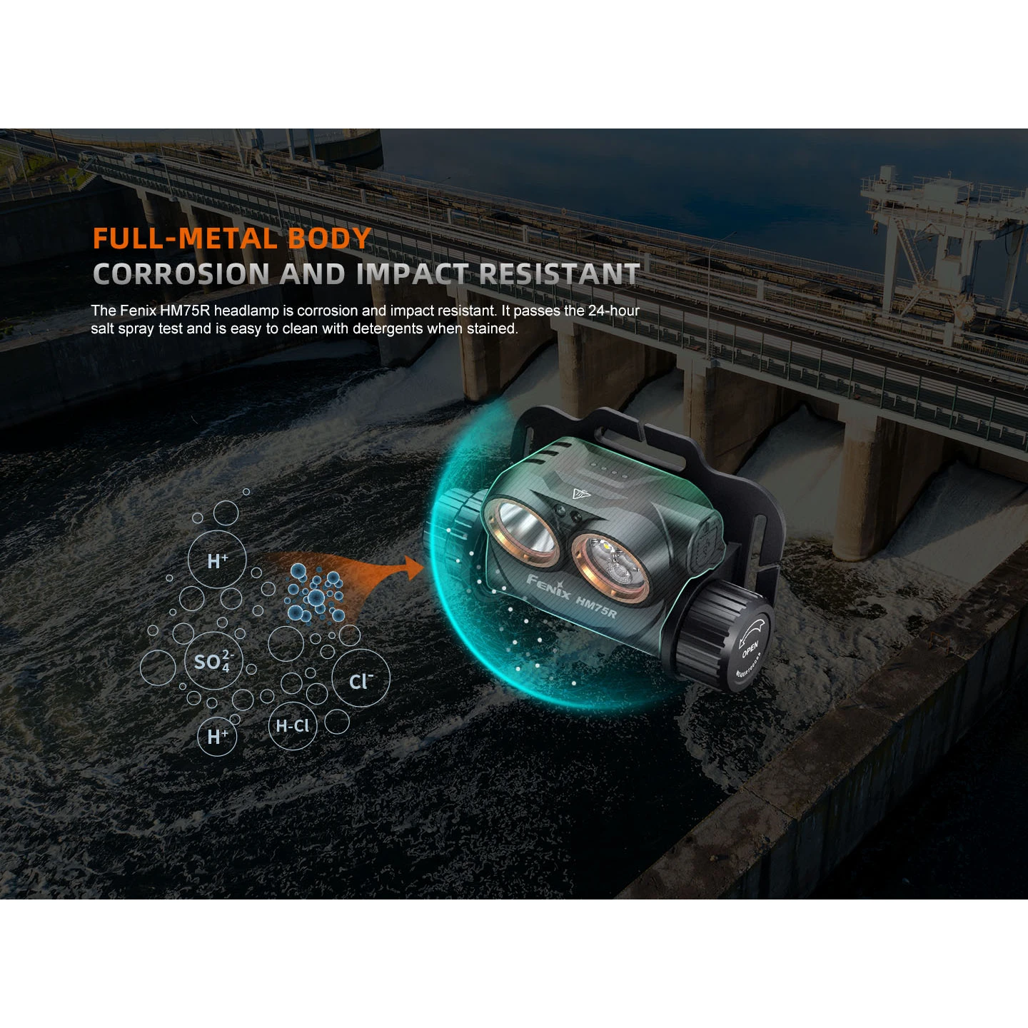 Fenix HM75R besteht aus einer leichten und langlebigen Magnesiumlegierung, seine Konstruktion ist gemäß IP68-Standard vollständig staub- und wasserdicht und zudem stoßfest gegen Stürze aus einer Höhe von 2 Metern.
