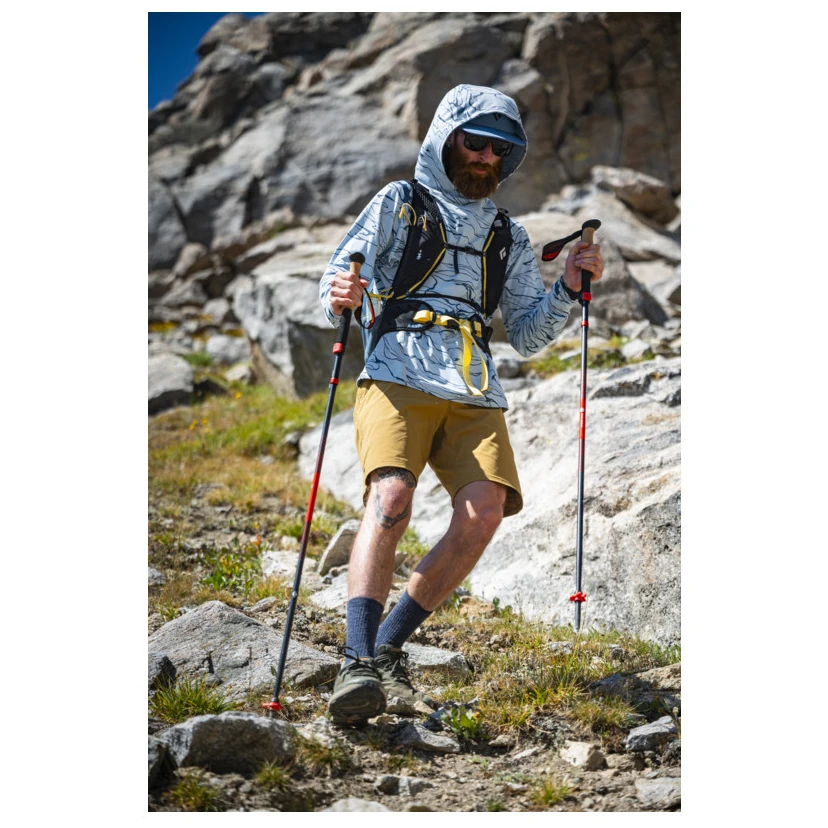 Die Konstruktion aus 100 % Carbon sorgt für hohe Steifigkeit und geringes Gewicht, während das dreiteilige Faltsystem ein schnelles Auf- und Abbauen ermöglicht. Die Längenverstellung mit dem FlickLock+-System bietet eine schnelle und sichere Anpassung an das aktuelle Gelände. Der größere Durchmesser der Segmente erhöht die Widerstandsfähigkeit und Stabilität bei Belastung.