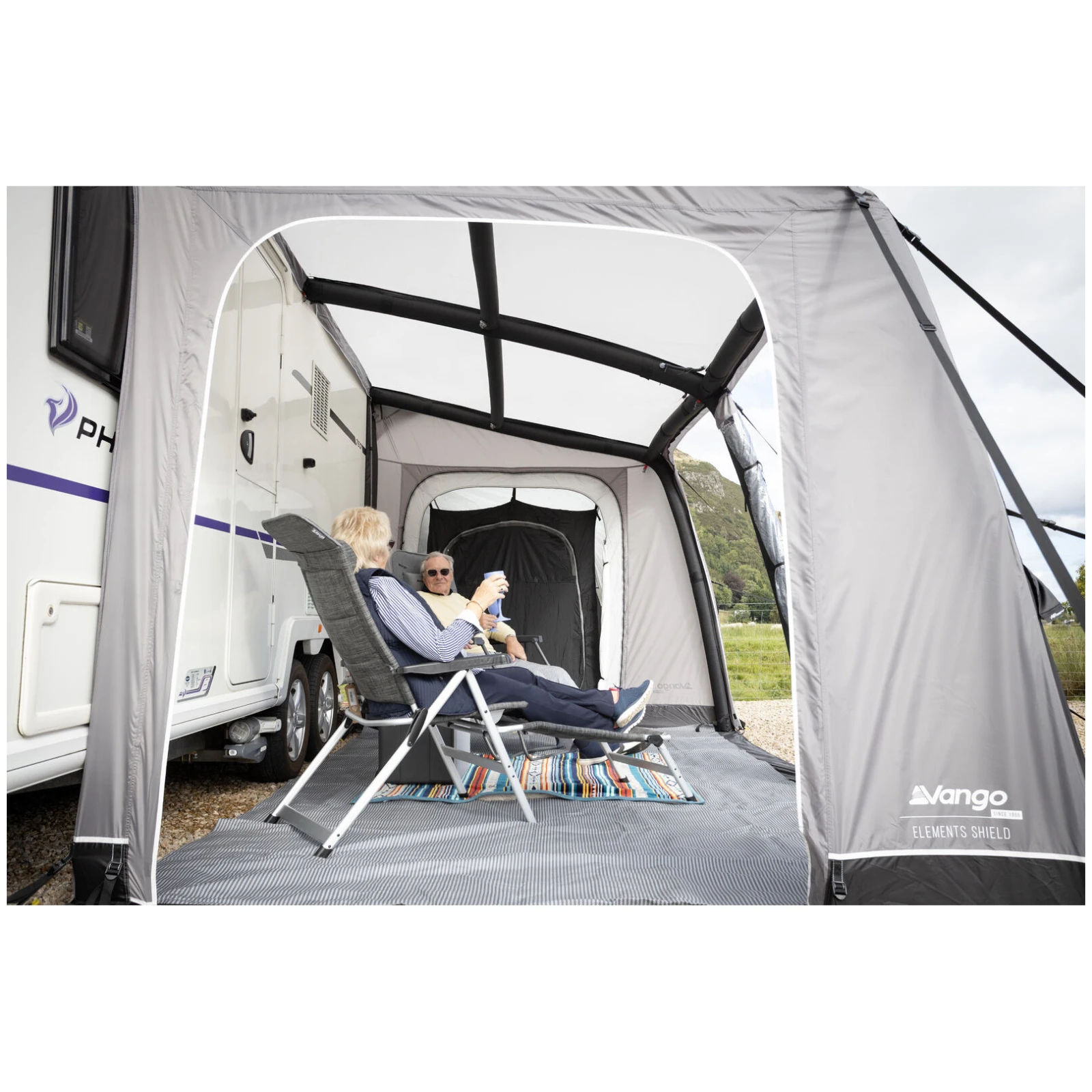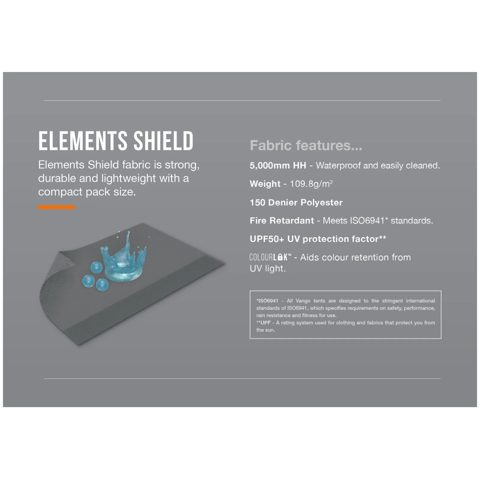 Leichtes und zugleich strapazierfähiges Elements Shield 150D-Gewebe mit einer Wassersäule von 5.000 mm bietet zuverlässigen Schutz vor Regen und schlechtem Wetter. Technologie ColourLok hilft, satte Farben auch bei langfristiger Nutzung zu erhalten. Das Vorzelt ist als Reisevorzelt konzipiert und eignet sich ideal für wiederholte Umzüge und Urlaubsreisen.