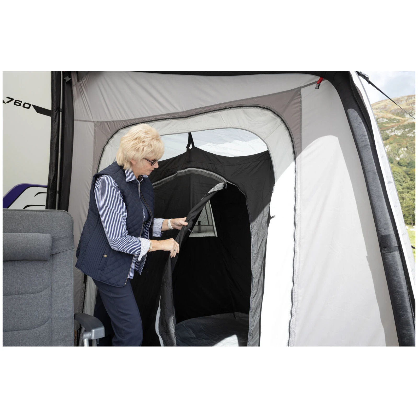 Große Panoramafenster Diamond Clear sorgen für eine hervorragende Aussicht in die Umgebung und ausreichend Tageslicht, während Reißverschlussvorhänge eine einfache Regulierung der Privatsphäre ermöglichen. Ergonomisch geformte und vorgebogene Träger erhöhen den Innenraum und die Stabilität auch bei windigen Bedingungen. Für maximalen Komfort sind im Lieferumfang auch ein Windschutz und Radkastenabdeckungen enthalten, die das Eindringen von Kälte verhindern.