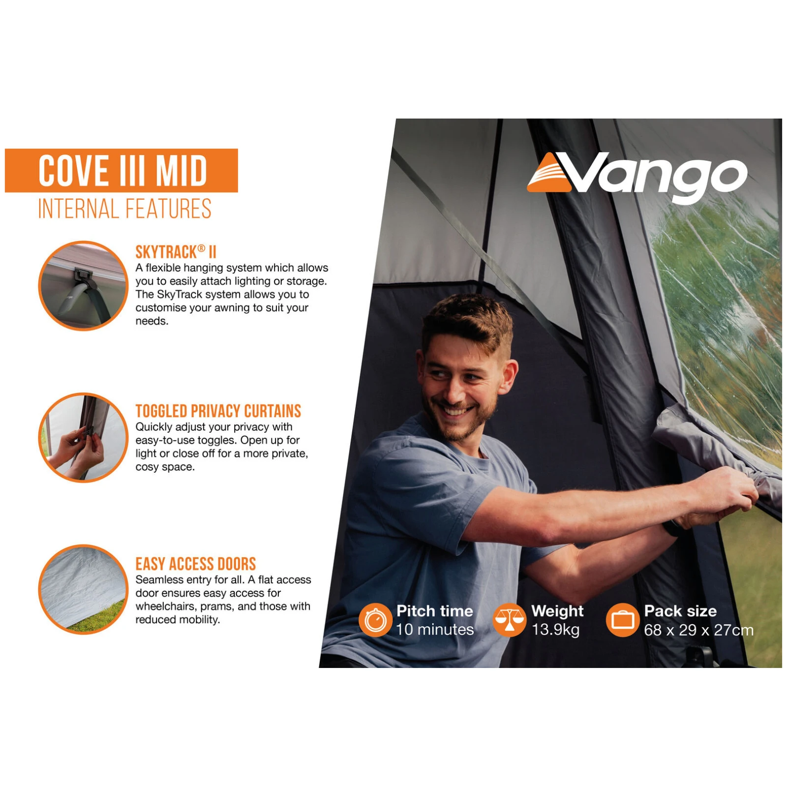 Das Vango Cove III Mid Vorzelt ist die ideale Erweiterung für Wohnmobile bei kürzeren Aufenthalten, Wochenenden und aktives Reisen. Dank seiner kompakten Packmaße nimmt es im Wohnmobil keinen unnötigen Platz ein, bietet aber nach dem Aufbau wertvollen zusätzlichen Wohnraum zum Entspannen, Kochen und für gemeinsame Momente. Cove III Mid ist ein vielseitiges Reisevorzelt, das um eine optionale Innenkabine für Gäste oder zusätzlichen Stauraum erweitert werden kann.