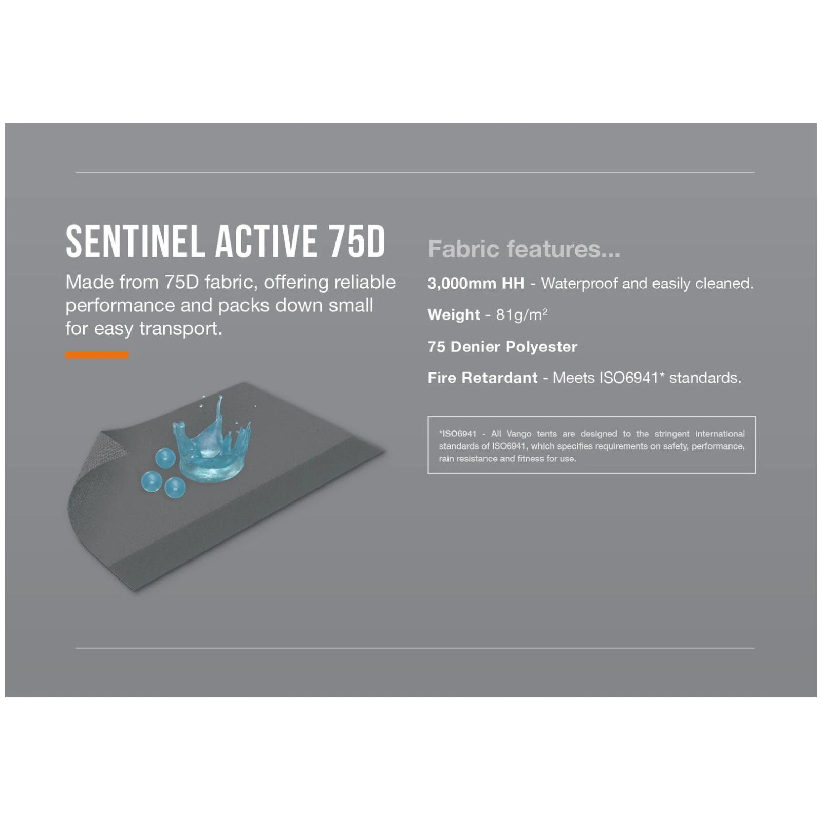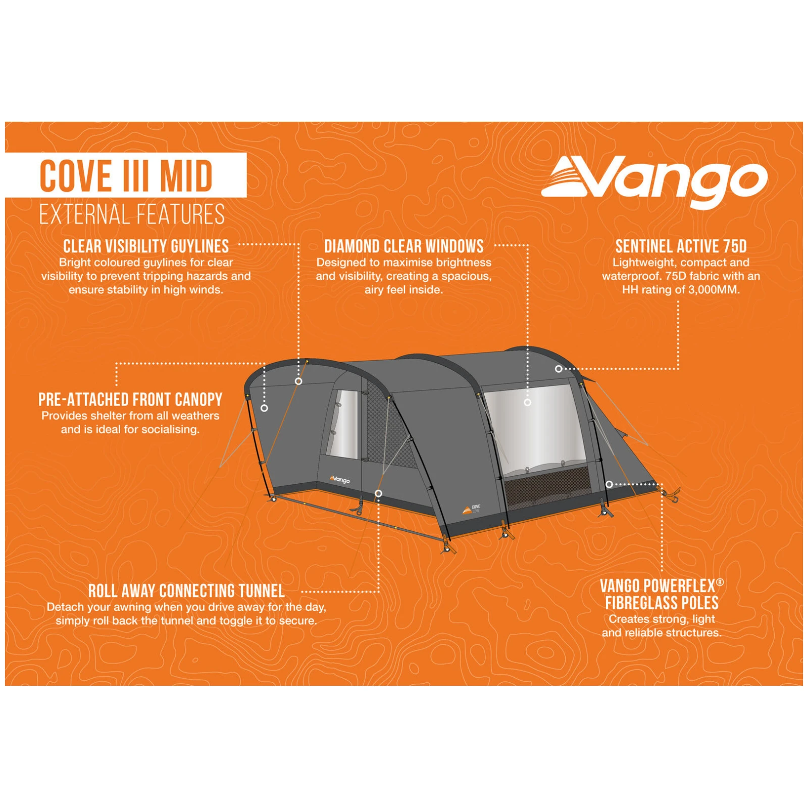 Der leichte, aber strapazierfähige Stoff Sentinel Active 75D mit einer Wassersäule von 3.000 mm sorgt für Regenschutz und gleichzeitig geringes Gewicht. Die Konstruktion besteht aus Vango PowerFlex Fiberglasstangen, die Festigkeit, Flexibilität und einfache Handhabung kombinieren. Das Vorzelt wurde vollständig nach der Norm EN ISO 5912 getestet und ist auch für windigere und regnerischere Bedingungen geeignet.