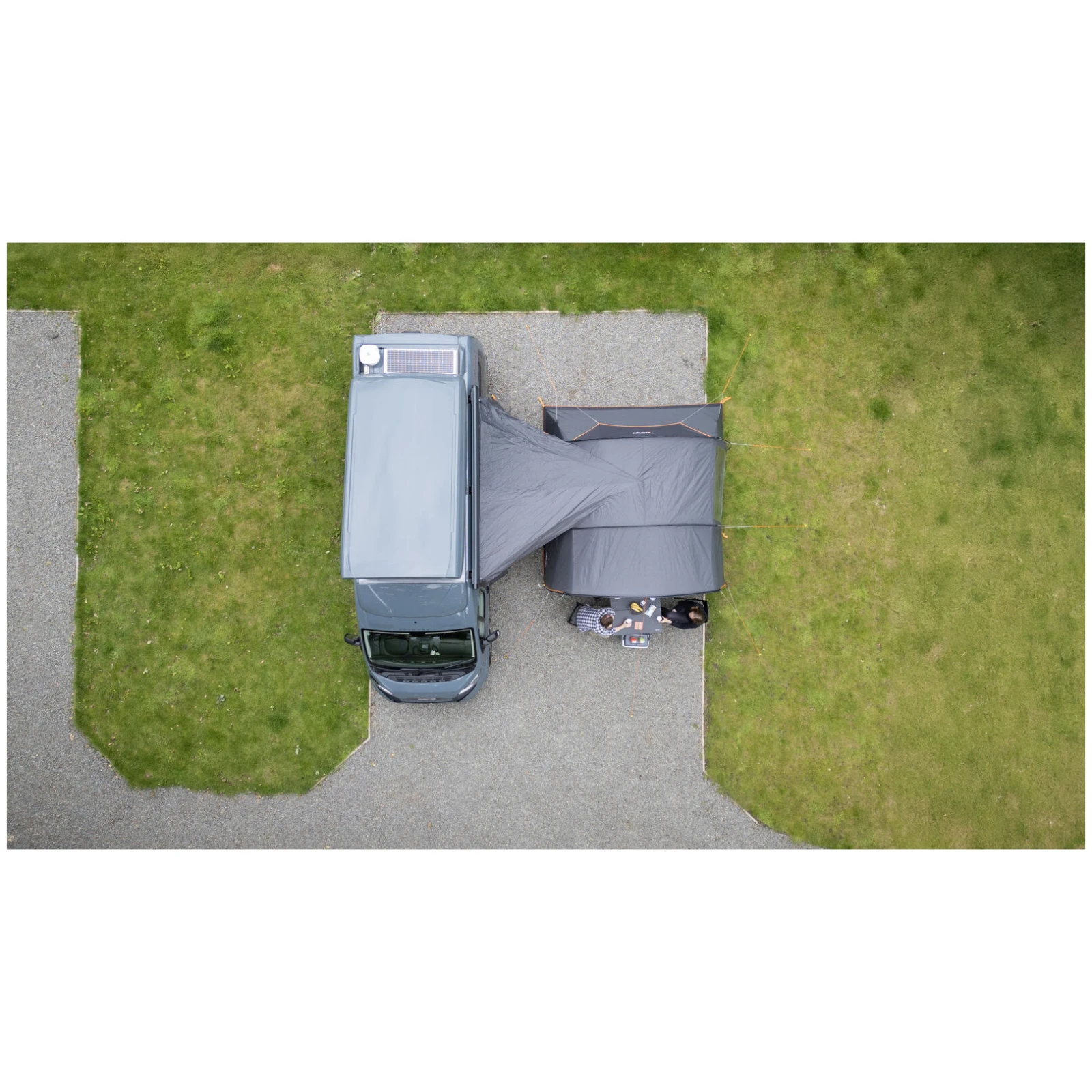 Der eingenähte Boden schützt vor Insekten und Zugluft und schafft zusammen mit dem vormontierten Vordach einen gemütlichen und geschützten Raum bei jedem Wetter. Der ausziehbare Drive Away Tunnel ermöglicht es, das Vorzelt leicht vom Fahrzeug zu trennen und an Ort und Stelle zu lassen, während Sie Ausflüge unternehmen. Die Stabilität bei starkem Wind wird durch das TBSII-System und die gut sichtbaren Leinen erhöht.