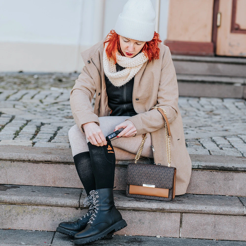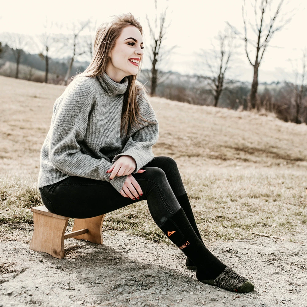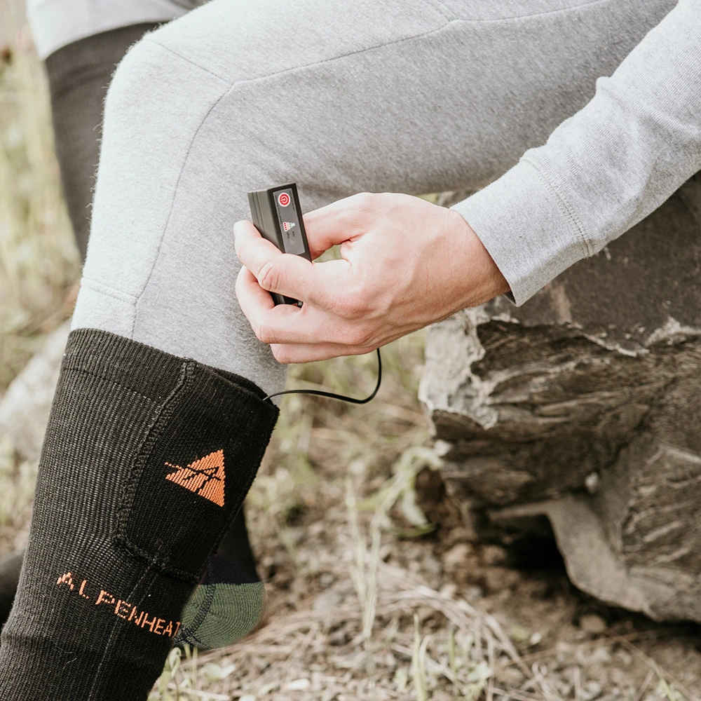 Die beheizten Kniestrümpfe Fire Wool Socks von Alpenheat sind ideal für kalte Tage. Sie enthalten eine Beimischung von Merinowolle, die für eine optimale Wärmeregulierung sorgt. Die Beimischung von Kupferfasern wirkt antibakteriell. Der Heizelement aus Carbonfasern ist unter den Zehen eingebettet und wird von einem kompakten, wiederaufladbaren Li-Ionen-Akku gespeist, der sich im oberen Teil der Socke befindet. Sie können drei Heizstufen nach Bedarf einstellen. Mit einer Akkuladung wärmen die Socken 5-10 Stunden. Das erneute Aufladen dauert 6 Stunden mit einem USB-Kabel.