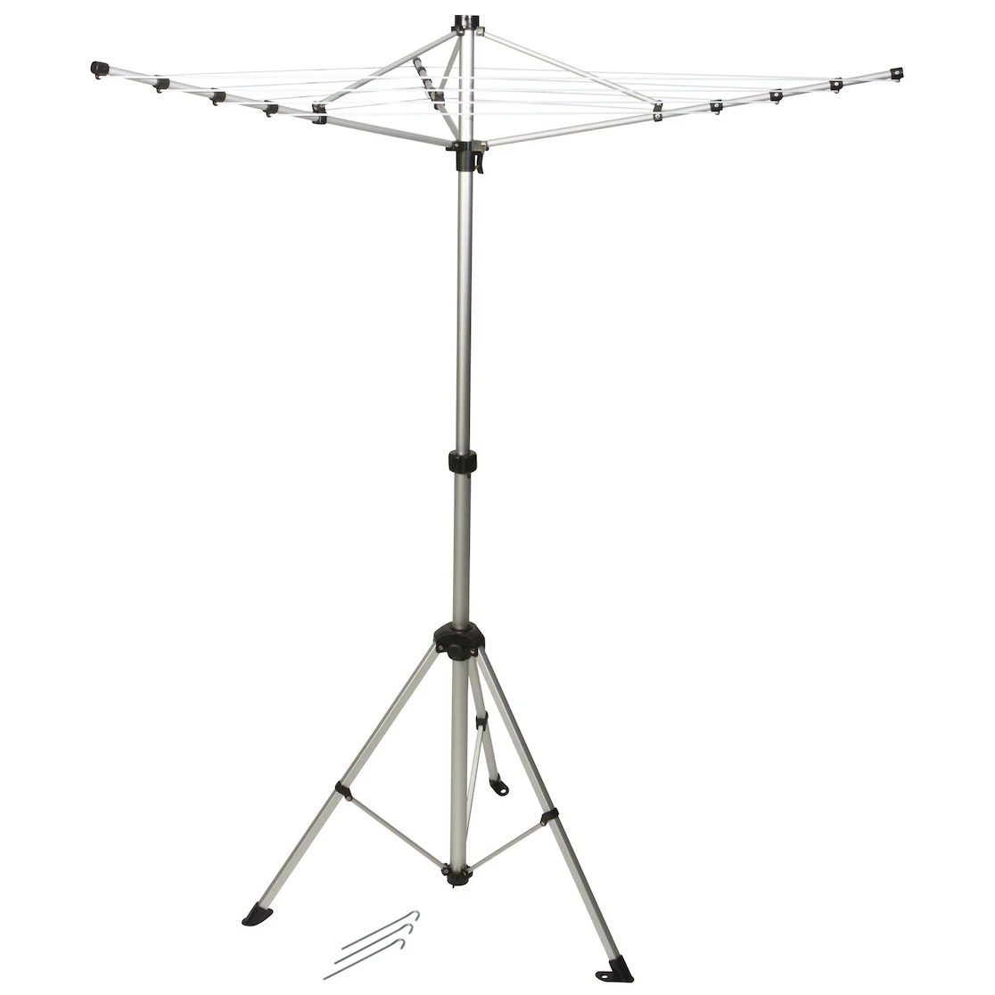 Dieser Wäscheständer für unterwegs ist so konzipiert, dass er minimalen Platz beansprucht und gleichzeitig viel Platz zum Trocknen bietet. Er bietet eine Gesamtlänge von 12 Metern Wäscheleine und steht auf einer stabilen Basis. Er lässt sich leicht zu einer sehr kompakten Größe zusammenklappen und passt problemlos in die mitgelieferte Transporttasche. Für eine sichere Befestigung bei Wind sind drei Heringe im Lieferumfang enthalten.