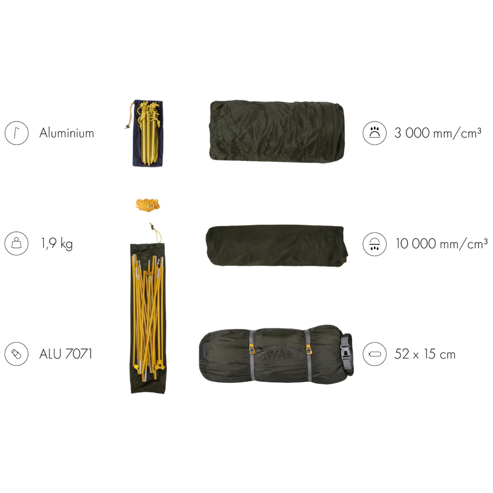 - Material Außenzelt: 20D Nylon Ripstop, beidseitige Silikonbeschichtung, 3.000 mm H2O
